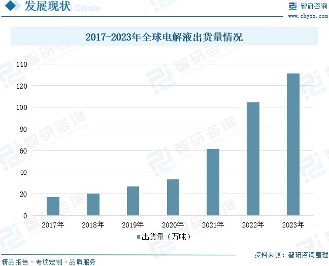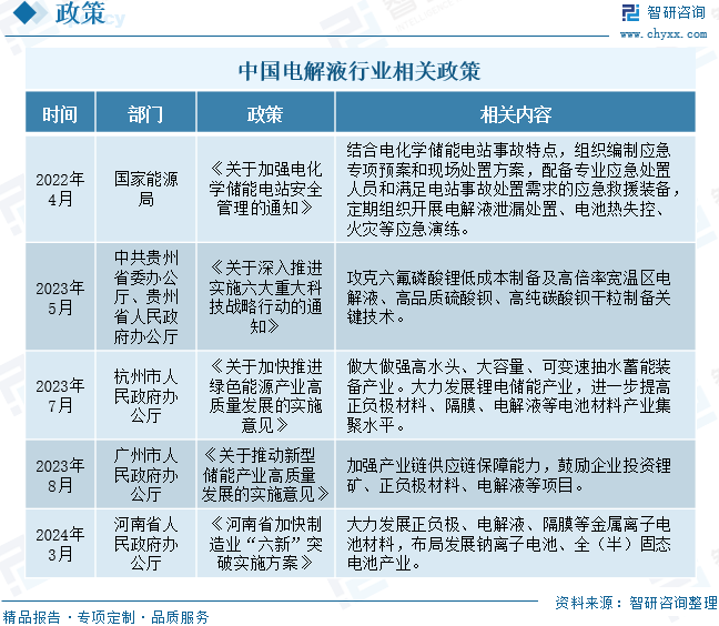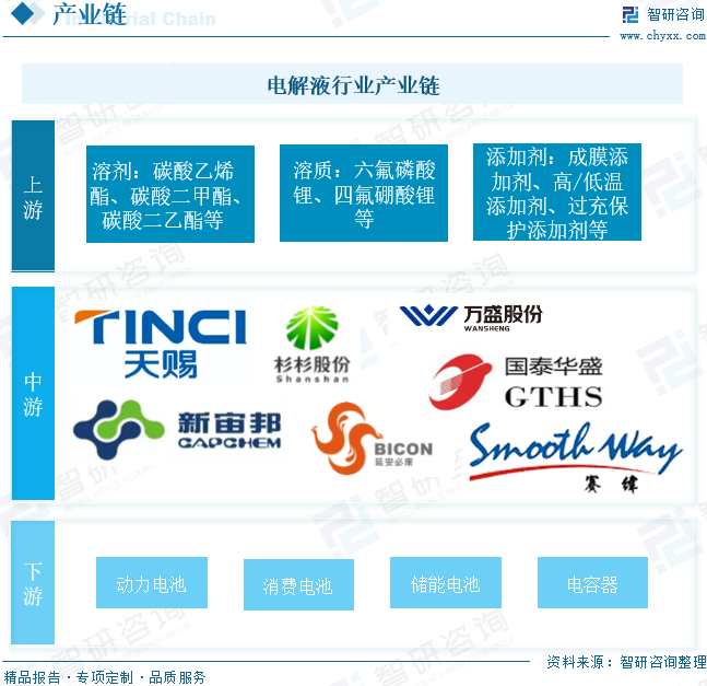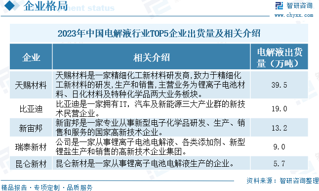 电解液是化学电池、电解电容等使用的介质,用于不同行业其代表的内容相差较大。有生物体内的电解液(也称电解质),也有应用于电池行业的电解液,以及电解电容器、超级电容器等行业的电解液。不同的行业应用的电解液,其成分相差巨大,甚至完全不相同。具体的电解液成分和配方可能因不同的锂电池类型,如锂离子电池、锂聚合物电池等以及应用需求而有所差异。此外,电解液的配方也在不断发展和改进,以提高电池性能、安全性和环境友好性。 电解液行业政策 近年来,中国加快出台电解液行业相关政策,以推动电解液行业的健康发展。2022年4月,国家能源局印发《关于加强电化学储能电站安全管理的通知》,提出要结合电化学储能电站事故特点,组织编制应急专项预案和现场处置方案,配备专业应急处置人员和满足电站事故处置需求的应急救援装备,定期组织开展电解液泄漏处置、电池热失控、火灾等应急演练。2024年3月,河南省人民政府办公厅印发《河南省加快制造业“六新”突破实施方案》,提出要大力发展正负极、电解液、隔膜等金属离子电池材料,布局发展钠离子电池、全(半)固态电池产业。 电解液行业产业链 电解液产业链上游主要包括溶剂、溶质、添加剂,其中溶剂包括碳酸乙烯酯、碳酸二甲酯等;溶质主要指六氟磷酸锂;电解液添加剂主要包括成膜添加剂、过充保护添加剂、高/低温添加剂等。中游为电解液的分类,主要有液体电解液、固体电解液、熔盐电解液等;电解液下游主要应用于动力电池、消费电池、储能电池、电容器。 全球电解液行业发展现状 电解液是锂离子电池的四大主要组成部分之一,是实现锂离子在正负极迁移的媒介,对锂电容量、工作温度、循环效率以及安全性都有重要影响。2022年全球电解液市场规模达到824.20亿元,同比增长92.39%。统计数据显示,2023年全球电解液市场规模为522.1亿元,同比下滑36.7%,主要原因在于电解液价格的下滑。 通常电解液占电池重量和体积的比重分别为15%、32%,其对纯度及杂质的含量要求非常高,生产过程中需要高纯的原料以及必要的提纯工艺。2017年至2022年全球电解液出货量由16.7万吨增长至104.3万吨,2023年全球电解液出货量约为131.26万吨。 中国电解液行业发展现状 近年来,随着全球及国内新能源汽车和锂电池行业快速发展,国内在电解液材料方面已具备一定的产能和技术优势,也使得我国电解液市场规模不断增长;尤其是2021年得到迅速发展。数据显示,2021年,我国电解液市场规模迅速增长,约为346.53亿元,同比上升355%。2023年我国电解液市场规模约为700亿元。 我国电解液产量不断增加,近年来随着锂电池产业的成熟,国产锂电池电解液从2002年左右开始进入市场,并逐步取代进口产品。2022年中国电解液出货量为89.1万吨,同比增长75.70%。2023年中国电解液出货量为113.8万吨,同比增长27.7%,中国电解液出货量的全球占比继续提升至86.7%。 电解液行业企业格局和重点企业分析 1、企业格局 中国作为全球最大的电动汽车市场,电解液市场规模也在不断扩大。中国电解液市场同样竞争激烈,国内品牌与国际品牌均在争夺市场份额,头部化集中较为明显。2023年中国电解液行业TOP5企业依次为天赐材料、比亚迪、新宙邦、瑞泰新材和昆仑新材。出货量依次是39.5万吨、19万吨、13.2万吨、9万吨、5.7万吨。TOP5企业出货量占比总计为75.9%,锂电电解液材料市场相对集中。2023年相比2022年发生了较大的变化,天赐材料的出货量虽然增加,但是所占的市场份额减少,其市场份额由2022年的35.9%降低到2023年的34.7%;新宙邦行业第二的位置被比亚迪取代;瑞泰新材与昆仑所占市场份额上升较为明显。 2、重点企业 广州天赐高新材料股份有限公司主营业务为精细化工新材料的研发、生产和销售,属于精细化工行业,主要产品为锂离子电池材料、日化材料及特种化学品。公司生产的锂离子电池材料主要为锂离子电池电解液和正极材料磷酸铁锂,均为锂离子电池关键原材料。同时,围绕主要产品,公司还配套布局电解液和磷酸铁锂关键原料的生产能力,包括六氟磷酸锂、新型电解质、添加剂、磷酸铁、碳酸锂加工以及锂辉石精矿等。电解液和正极材料磷酸铁锂用于生产锂离子电池,锂离子电池在新能源汽车、消费电子产品和储能领域均有广泛应用。数据显示,2023年天赐材料锂离子电池材料营收为141.04亿元。 深圳新宙邦科技股份有限公司主营业务是新型电子化学品及功能材料的研发、生产、销售和服务,主要产品包括电池化学品、有机氟化学品、电容化学品、半导体化学品四大系列。公司通过自主研发、产学研合作和上下游协同等方式,开展产品与技术创新,为客户提供高品质的产品和解决方案,并通过前沿研究持续培育公司新增长点。经过多年发展,公司掌握了锂离子电池电解液及相关材料的核心生产技术,能生产高质量产品,为客户提供全方位、多元化的服务,在行业中享有较高的市场地位,与行业主要头部客户均建立了长期稳定的合作关系。数据显示,2023年新宙邦电池化学品营收为50.53亿元;有机氟化学品营收为14.25亿元;电容化学品营收为6.29亿元;半导体化学品营收为3.11亿元。 电解液行业发展趋势 1、产业政策支持 新能源、新材料、新能源汽车行业作为战略新兴产业与先导产业同时受国家相关产业政策支持,具有巨大的发
