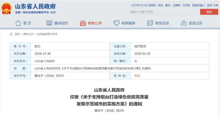 2024年12月30日,山东省人民政府印发《关于支持烟台打造绿色低碳高质量发展示范城市的实施方案》的通知,文件中提到,拓展绿色电力应用场景。实施电力系统数字化、智慧化改造升级,优先调度可再生能源电力。加快城市级数字化虚拟电厂、能耗及碳排放管理平台和新型多元化储能中心项目建设。积极发展绿电交易,扩大绿电消费。打造中集海上漂浮式光伏实证基地、东方电子零碳智能产业园、烟台港绿色智慧零碳码头等示范应用场景。到2027年,非化石能源消费比重达到20%以上。 附政策原文: 山东省人民政府印发《关于支持烟台打造绿色低碳高质量发展示范城市的实施方案》的通知 鲁政字〔2024〕202号 烟台市人民政府,省政府各部门、各直属机构,各大企业: 《关于支持烟台打造绿色低碳高质量发展示范城市的实施方案》已经省委、省政府同意,现印发给你们,请认真贯彻执行。 山东省人民政府 2024年12月30日 (此件公开发布) 关于支持烟台打造绿色低碳高质量发展示范城市的实施方案 烟台是全省重要制造业基地和沿海开放城市。为进一步增强烟台城市发展能级,充分发挥引领带动作用,加快建设绿色低碳高质量发展示范城市,制定本实施方案。 一、总体要求 坚持以习近平新时代中国特色社会主义思想为指导,深入贯彻党的二十大和二十届二中、三中全会精神,全面落实习近平总书记视察山东重要讲话精神,完整准确全面贯彻新发展理念,主动服务和融入新发展格局,以绿色低碳高质量发展为主题,着力在发展新质生产力、壮大绿色循环经济、构建新型能源体系、深化改革扩大开放、建设美丽山东、落实双碳战略等方面先行示范,以更高定位开创万亿级城市新局面,坚定扛牢“走在前、挑大梁”的使命担当、为奋力谱写中国式现代化山东篇章作出更大贡献。 主要目标是:到2027年,示范城市建设取得重要突破,现代化产业体系核心竞争力持续增强,清洁能源综合利用水平全国领先,绿色低碳科技创新能力大幅提高,区域城乡协调联动发展格局更加优化,城市人居环境和居民生活品质显著跃升。到2030年,全面建成绿色低碳高质量发展示范城市。 二、加快建设现代化产业体系,大力发展新质生产力 (一)做强标志性产业集群。推动制造业高端化、智能化、绿色化,进一步壮大高端化工、汽车、清洁能源、航空航天、生物医药等优势产业,争创国家新型工业化示范区。以裕龙炼化一体化、万华新材料项目为引领,加快发展乙烯、聚氨酯等化工新材料,打造世界级绿色石化产业集群。以通用东岳奥特能超级工厂、潍柴(烟台)新能源动力项目为引领,加快发展新能源汽车、动力电池产业,打造百万辆汽车产业集群。以海阳核电、招远核电等项目为引领,加快发展核风光氢储清洁能源装备产业链,打造千亿级清洁能源产业集群。以东方航天港项目为引领,构建从火箭发射到卫星信息的全链生态,打造航空航天产业集群。以蓝色药谷生命岛项目为引领,加快发展生物创新药、医用同位素、合成生物等,打造现代生物制药产业集群。到2027年,规上工业总产值达到1.7万亿元以上。(牵头单位:省工业和信息化厅、省发展改革委,责任单位:省能源局) (二)做优现代海洋产业。实施海洋牧场“百箱计划”,高水平建设长岛“蓝色粮仓”海洋经济开发区。加快建设蓬莱海上风电国际母港、空天海智造、中集零碳智造等项目,支持培育现代渔业、海工装备、海洋新能源等省级海洋特色产业集聚区,打造世界领先的海工装备制造基地。到2027年,海洋生产总值达到3000亿元以上。(牵头单位:省发展改革委、省海洋局,责任单位:省工业和信息化厅、省农业农村厅、省能源局) (三)做大数字经济产业。深入实施综合算力提质、“智改数转”工程,加快橙色云工业互联网平台、烟台城市智算中心建设,谋划建设莱州湾、套子湾海底数据中心和LNG冷能型数据中心,成立数字经济产业联盟,培育一批国家、省级工业互联网平台和智能工厂,打造烟台总部经济基地、东方电子智慧能源创新产业园等数字经济集聚区。到2027年,规上工业企业数字化转型基本实现全覆盖,数字经济核心产业增加值占比达到13.5%。(牵头单位:省工业和信息化厅,责任单位:省大数据局、省发展改革委) (四)培育发展未来产业。支持烟台市培育新一代核能、生命科学、深海空天、人工智能、人形机器人、新型电子材料等六大未来产业,建设数字智能(光电传感)、南山航空材料产业园等未来产业加速园,规划建设未来产业研究院,设立未来产业发展基金。到2027年,未来产业产值达到1300亿元。(牵头单位:省发展改革委,责任单位:省工业和信息化厅、省科技厅) (五)增强科技创新策源能力。高水平建设先进材料与绿色制造山东省实验室、新药创制山东省实验室,支持烟台建设核能领域高能级创新平台,支持万华化学参与先进材料领域全国重点实验室重组。指导烟台深度融入全省“2+N”人才聚集雁阵格局,打造一批开放程度较高、创新资源密集、人才吸引力强的集聚区。依托泰山人才工程、领军人才筑峰计划、卓越工程师培育专项行动,精准引育高层次人才,持续壮大科技领军人才、青年科学家队伍。建立多学科交叉融合人才培养机制,积极争创全国产教融合试点城市。到2027年,全社会研发经费投入强度达到2.8%。(省科技厅、省委组织部、省教