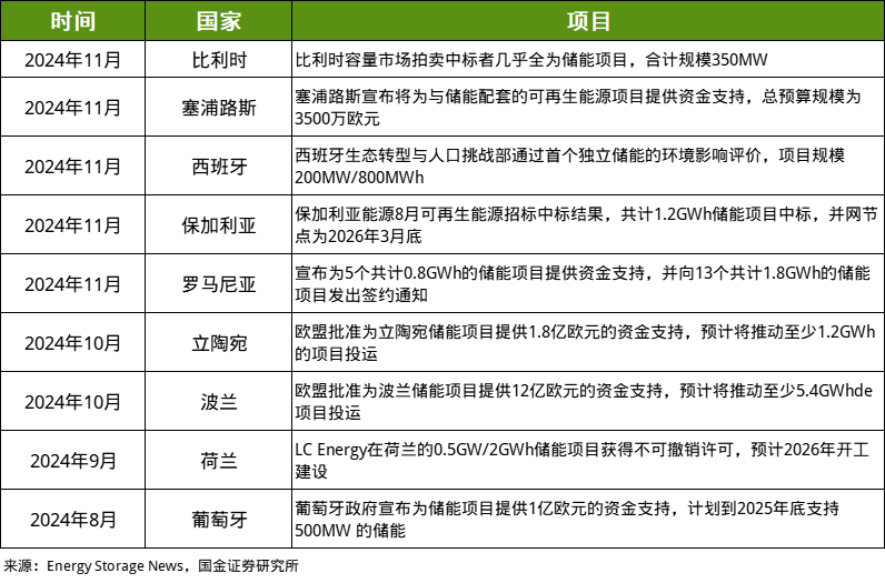 根据TrendForce集邦咨询数据显示,2024年新型储能新增装机预计为26GWh,增速为40%;预计2025年新型储能新增装机预计为37GWh,增速为31%。 从装机类型来看,由于部分地区补贴退出,导致户储需求减少;但大储需求高增,所以整体装机仍呈现正增长,大储及工商储将加速发展。 01欧洲多国大储项目取得进展支撑2025年需求释放 TrendForce集邦咨询表示,2025年欧洲大储装机量占比或将超户储。预计2025年欧洲大储装机量将达21GWh,同比增长75%,大储装机占比达60%,超越户储的装机占比(户储占比35%),这意味着欧洲储能市场将逐步从以户储为主导转向以大储为主导。此外,2025年大储装机将以英国与意大利为主,欧洲大储有市场化的盈利模式,系统集成价格或接近美国市场,将为在欧洲市场有渠道和产品布局的中国龙头企业贡献增量。 2024年7月以来,欧洲多个国家大储项目取得进展,支撑未来两年需求释放。 图:储能项目进展 02 2025年储能装机增速有所放缓德英意三国占主导地位 TrendForce预计,2025年储能装机增速有所放缓,德英意三国占主导地位。除德国、意大利、英国外,欧洲地区其余各国风光发电量占比提升也较为明显,储能需求有望开始逐步释放。2024年下半年比利时、塞浦路斯、西班牙、保加利亚等多个欧洲国家均有大储项目取得积极进展。 图:欧洲各国储能装机 随着欧洲其余各国储能盈利机制逐步明确,需求景气度有望进一步向上。TrendForce预计2024/2025年欧洲储能装机分别为26GWh/35GWh,同比增长40%/31%。