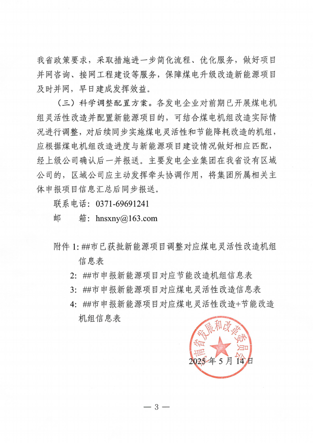 5月14日,河南发改委发布《关于组织开展2025年煤电机组升级改造新能源项目申报有关事项的通知》(简称“通知”)。 《通知》明确,按照“应报尽报”原则,与煤电机组升级改造对应的新能源项目均可参与本次申报。具体申报要求和配置原则如下: (一)纳入开发方案、已实施灵活性改造,并完成深调认定的煤电机组,鼓励其继续实施节能降耗改造,按照煤电装机规模的8%增配新能源规模。 (二)纳入开发方案、已实施灵活性改造,但未完成深调认定的煤电机组,按照现有程序实施改造和认定后,办理新能源项目并网手续。若继续实施节能降耗改造,按照煤电装机规模的8%增配新能源规模。 (三)未纳入开发方案但已实施灵活性改造的煤电机组,按照装机规模的14%配置新能源项目,依程序申请纳入开发方案并完成改造和认定后,办理新能源项目并网手续。若继续实施节能降耗改造,按照煤电装机规模的8%增配新能源规模。 (四)未纳入开发方案且未实施灵活性改造的煤电机组,应同步开展灵活性和节能降耗改造,按照煤电装机规模的22%配置新能源规模。 《通知》强调,要科学调整配置方案。各发电企业对前期已开展煤电机组灵活性改造并配置新能源项目的,可结合煤电机组改造实际情况进行调整,对后续同步实施煤电灵活性和节能降耗改造的机组,应根据煤电机组改造进度与新能源项目建设情况做好相应匹配,经上级公司确认后一并报送。 拟参与本次申报的项目,抓紧完善新能源项目前期支持性材料,切实排除颠覆性因素,于6月30日前将更新材料上传至新能源项目管理系统前期库()。 需要补充的是,2024年05月13日,河南发改委曾发布《关于开展煤电机组灵活性改造项目深度调峰能力认定工作的通知》。文件指出,煤电机组灵活性改造项目深度调峰能力认定适用于:配置新能源项目纳入2022-2025年度开发方案,且最小发电出力经相关性能试验达到要求的煤电机组。 此外,申请认定的灵活性改造项目应先于或同步于新能源本体项目建设,且机组最小发电出力不高于额定功率的25%,原则上于2025年底前全部完成。 近年来,我国煤电行业经历了大刀阔斧的优化提升。从超低排放改造到节能降碳改造、灵活性改造、供热改造“三改联动”,再到低碳化改造,煤电机组的能效提升、灵活性增强和环保水平优化成果显著。 2021年10月29日,国家发展改革委、国家能源局发布《关于开展全国煤电机组改造升级的通知》,“三改联动”在煤电行业拉开帷幕,激发煤电绿色低碳发展新活力。 2025年3月26日,国家发展改革委、国家能源局联合印发《新一代煤电升级专项行动实施方案(2025—2027年)》,旨在夯实煤电兜底保障作用,积极推进煤电转型升级,助力构建新型电力系统。 原文如下: