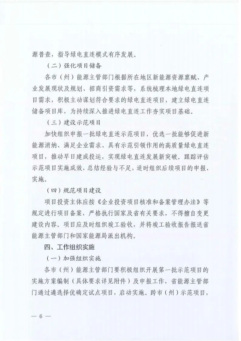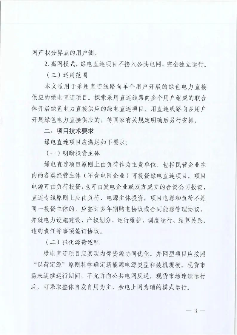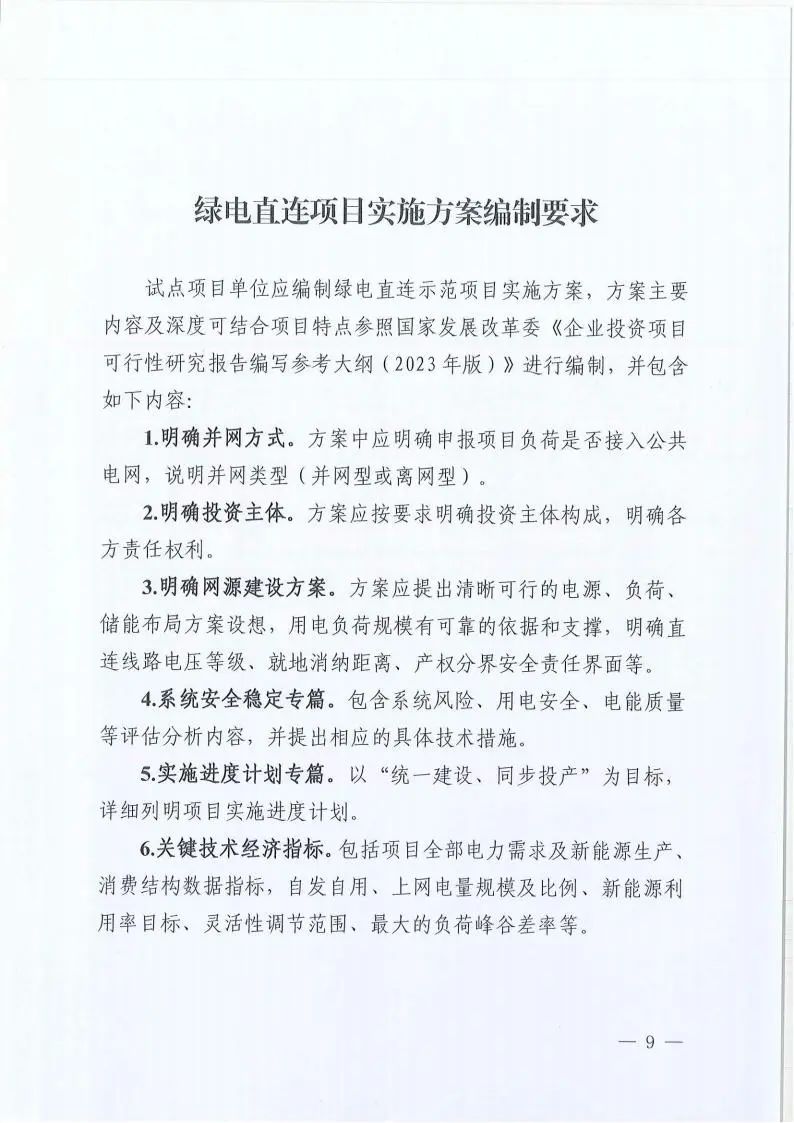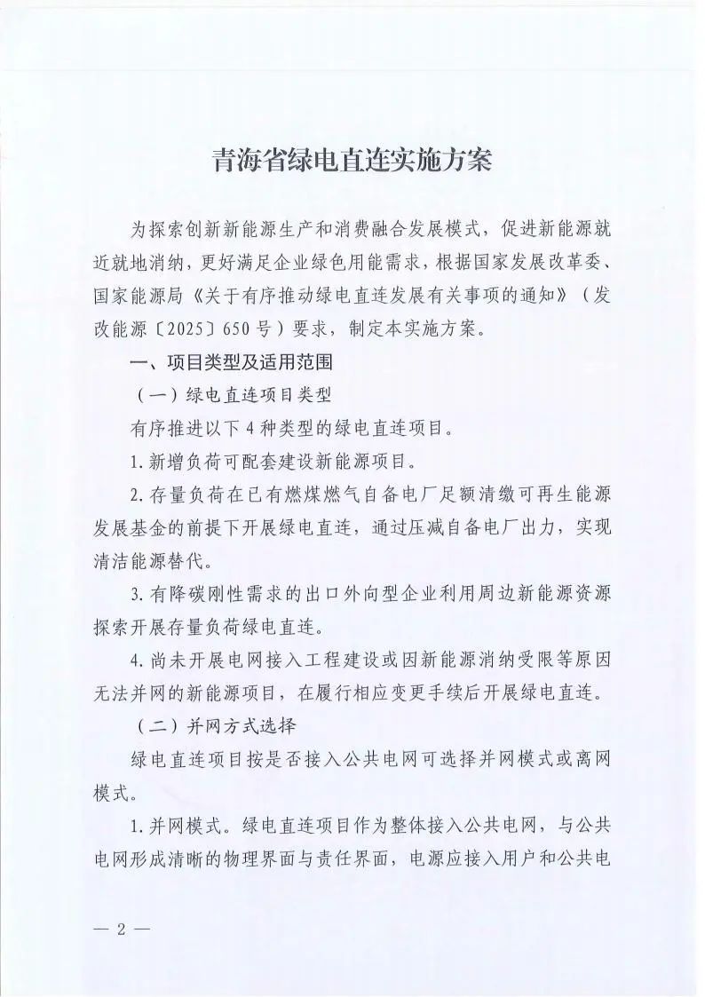 7月16日,青海省能源局发布关于印发《青海省绿电直连实施方案》的通知。文件明确,有序推进以下4种类型的绿电直连项目: 1.新增负荷可配套建设新能源项目。 2.存量负荷在已有燃煤燃气自备电厂足额清缴可再生能源发展基金的前提下开展绿电直连,通过压减自备电厂出力,实现清洁能源替代。 3.有降碳刚性需求的出口外向型企业利用周边新能源资源探索开展存量负荷绿电直连。 4.尚未开展电网接入工程建设或因新能源消纳受限等原因无法并网的新能源项目,在履行相应变更手续后开展绿电直连。 项目整体新能源年自发自用电量占总可用发电量的比例应不低于60%,占总用电量的比例应不低于30%,并不断提高自发自用比例,2030年前不低于35%。上网电量占总可用发电量的比例上限一般不超过20%。 文件提出,强化源荷适配。绿电直连项目应实现内部资源协同优化。并网型项目应按照“以荷定源”原则科学确定新能源电源类型和装机规模。现货市场未连续运行期间,不允许向公共电网反送。现货市场连续运行后,可采取整体自发自用为主,余电上网为辅的模式运行。 此外,政策解读中指出,《方案》在承接国家政策规定的适用范围基础上,充分结合青海省实际,不设直连线路距离限制,为绿电直连可持续发展留足空间,激活市场、吸引投资。 原文件如下: 《青海省绿电直连实施方案》政策解读 现将《青海省绿电直连实施方案》(以下简称《实施方案》)相关政策解读如下: 一、制定背景 绿电直连项目是新能源融合发展模式的重要创新,是丰富新型电力系统形态的重要探索,在能源绿色低碳转型新形势下,为满足新能源就近消纳和用户绿电消费需求提供更多选择。国家发展改革委、国家能源局于5月21日印发《关于有序推动绿电直连发展有关事项的通知》(发改能源〔2025〕650号),要求省级能源主管部门细化措施,引导项目科学合理评估需求,做好项目管理和运行监测工作,推动绿电直连模式有序发展。根据省政府工作安排,在深入开展调研分析、学习借鉴外省经验、广泛征求意见建议的基础上,编制完成了《实施方案》。 二、主要考虑 《实施方案》编制过程中,注重全面贯彻落实国家部署要求,坚持立足省情实际,充分考虑我省新能源产业发展和全社会日益增长的绿色用能需要,分层分类精准施策,力求实用管用、便于落实,重点考虑和把握了以下几个方面:一是坚持问题导向。将绿电直连作为解决新能源消纳问题和提高能源配置效率的重要抓手,聚焦新能源“盘活存量、优化增量”,支持建设离网型、并网型两种模式,明确新能源自发自用和上网电量比例,引导新能源项目尽可能就近就地消纳利用,奠定项目“绿”的基础。二是全方位支持。覆盖全省各产业领域,有序推进四种类型的绿电直连项目,为重点企业(尤其是出口外向型)提供可验证的绿电供应渠道,解决绿电溯源与高碳转型痛点,响应传统和新兴高载能行业增绿减碳的用能诉求,协同推进产业绿色转型发展和构建绿色电力消费体系。三是探索创新突破。在承接国家政策规定的适用范围基础上,充分结合我省实际,不设直连线路距离限制,为绿电直连可持续发展留足空间,激活市场、吸引投资。 三、主要内容 《实施方案》共四个部分。 第一部分为“项目类型及适用范围”。主要明确新增负荷、拥有自备电厂的存量负荷、有刚性需求的出口型企业、尚未开展电网接入工程建设或因新能源消纳受限等原因无法并网的新能源项目可开展绿电直连。 第二部分为“技术要求”。从明晰投资主体、强化源荷适配、合理确定接入电压等级、确保安全稳定、提升系统友好性、优化并网容量申报、依规缴纳相关费用等方面提出要求。 第三部分为“重点工作任务”。从加强统筹规划、强化项目储备、建设示范项目、规范项目建设等方面提出任务和措施。 第四部分为“工作组织实施”。提出加强组织实施、强化政策支持、压实主体责任、强化全过程监管、定期评估成效等措施,确保方案落地实施,为做好绿电直连工作提供保障和支撑。